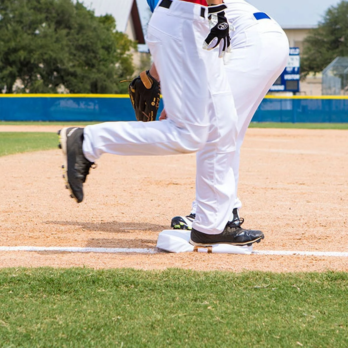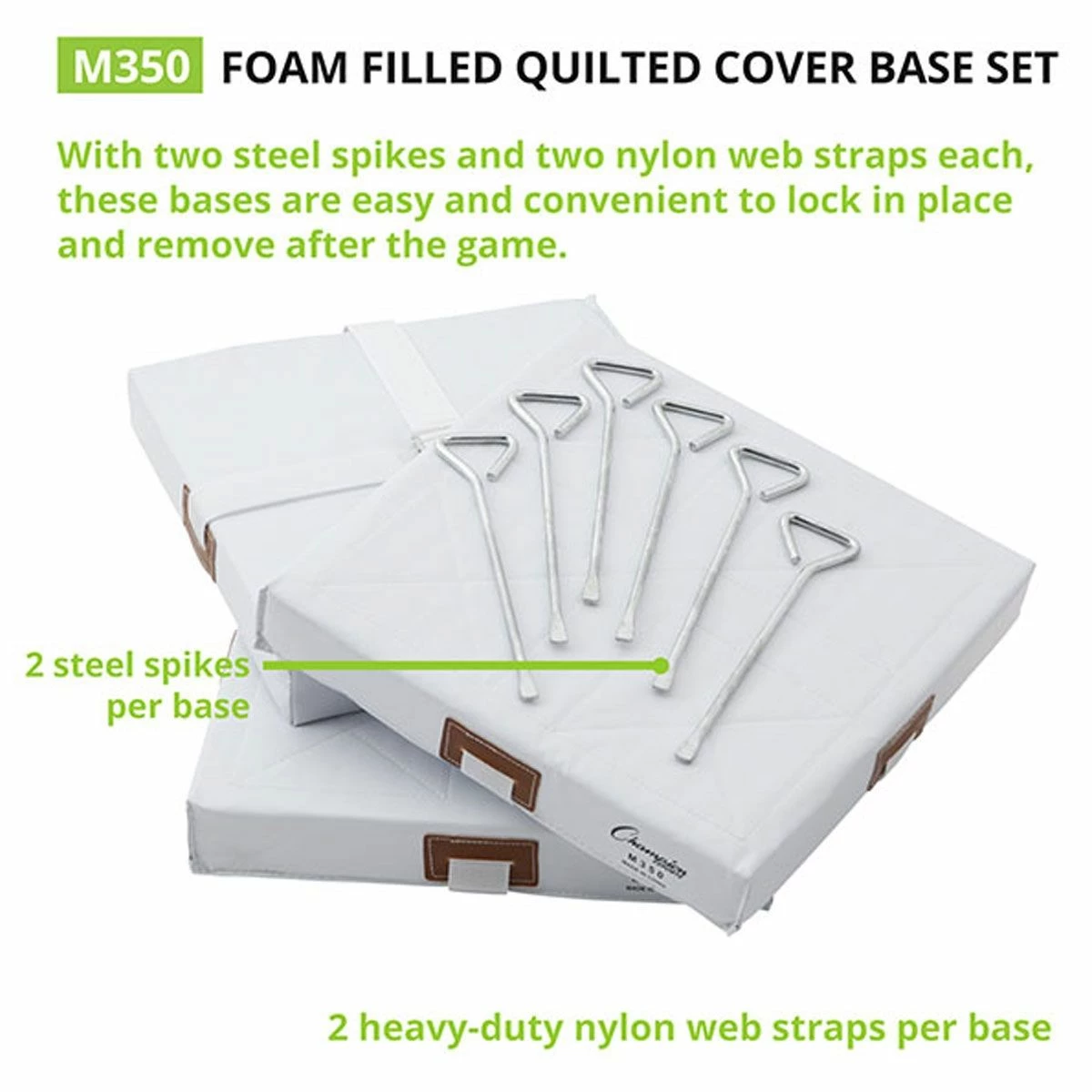 Complete your baseball diamond with this set of 3, foam-filled economy bases. The heavy-duty nylon straps and steel spikes secure each base to the ground. The cushy foam filling and quilted cover prevent injuries when athletes slide to base.