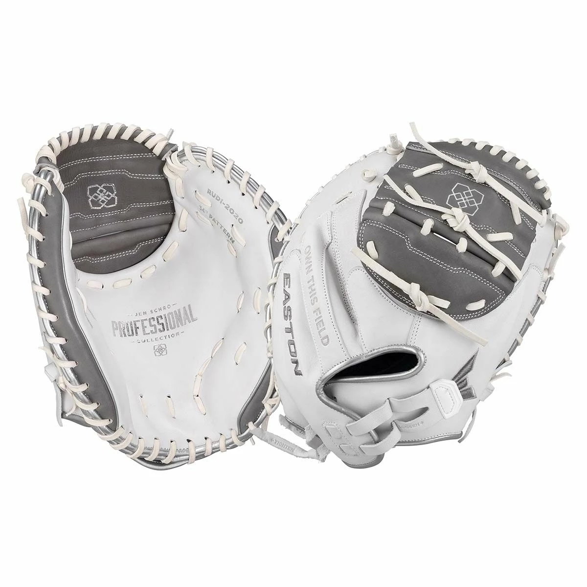 The Easton RUDI-2020 Professional Signature fastpitch catcher’s mitt has fastpitch-specific patterns, making it perfect for high level softball catchers. The 34″ mitt is constructed of Premium Reserveโข USA steer hide leather with a classic cowhide palm lining for maximum comfort, and steerhide binding for enhanced durability. This glove also features a rolled leather welting system for an expedited break-in process as well as a water-resistant Axยฎ Suede microfiber wrist liner for breathability.