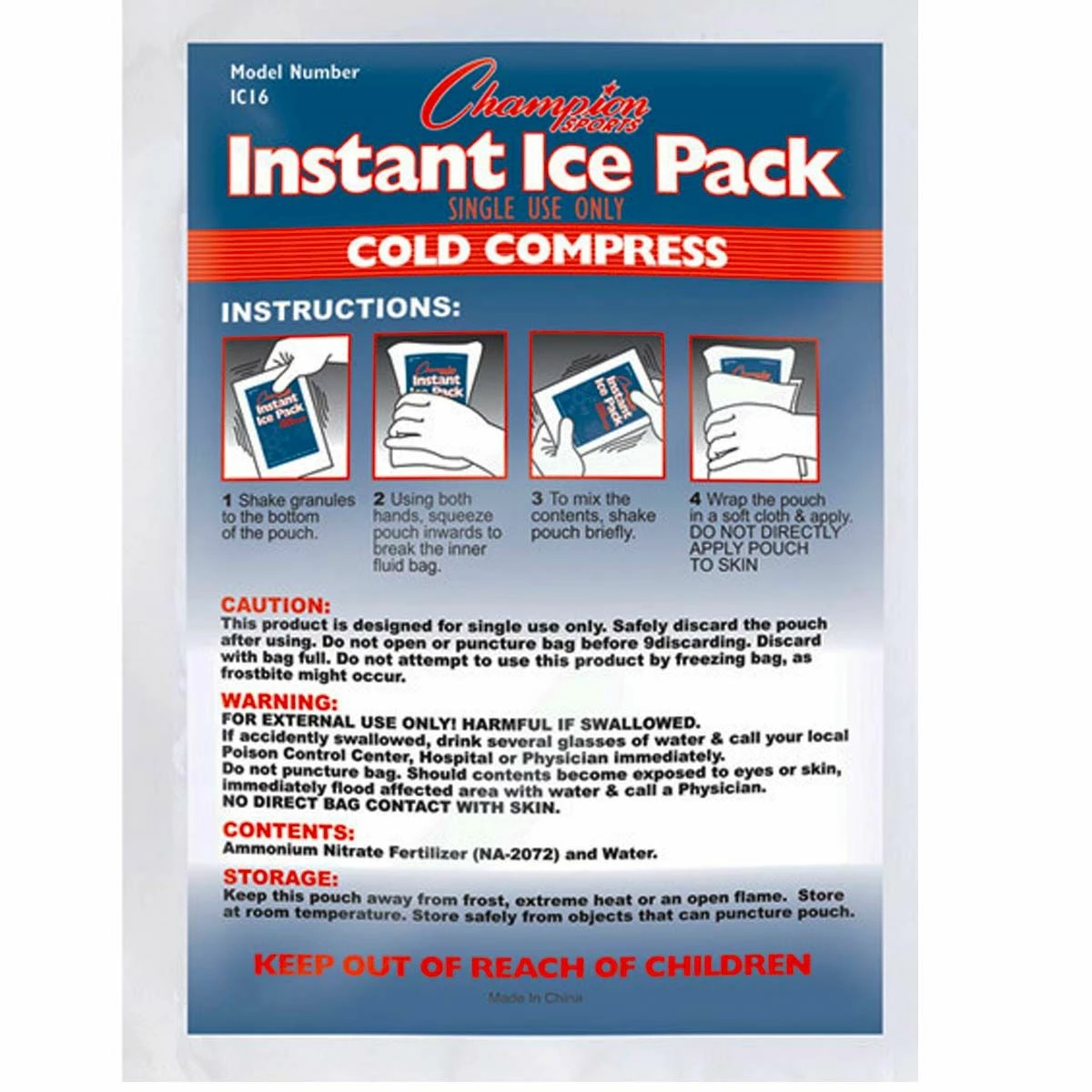 The instant cold packs from Champion offer the convenient first aid you need at an unbeatable price. Simply squeeze the packs to activate.
