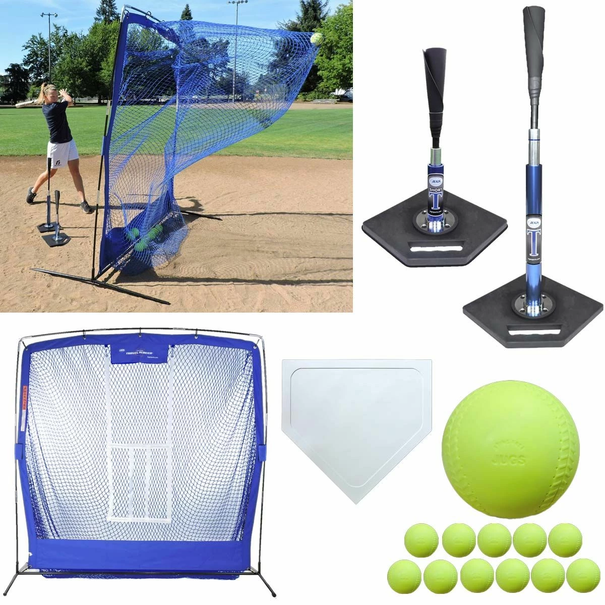 The Jugs softball T hitting station package has everything you need for a quick BP session anywhere. This batting practice package includes a 6.5′ x 6.5′ travel screen, the Jugs T batting tee (#A32-080). the Jugs Short T batting tee (#A32-082), 1 dozen seamed softballs and a throw-down home plate to simulate a realistic batting situation. The practice travel screen’s frame is made of stable 5/8″ fiberglass bungee poles with a sturdy 1″ steel tube base that won’t tip over in windy conditions. The screen features a white-lined strike zone as well as a collection area that holds hit balls. The travel screen comes complete with a 30″ nylon travel bag for easy transport. The Short T batting tee has a quick adjustment range of 16โ to 23,โ allowing hitters to work on the pitch at the bottom of the strike zone. The Jugs T batting tee features a quick adjustment range of 24โ to 45โ to simulate top of the zone pitch locations. Both batting tees are equipped with cut-out handles in the base for quick transport.