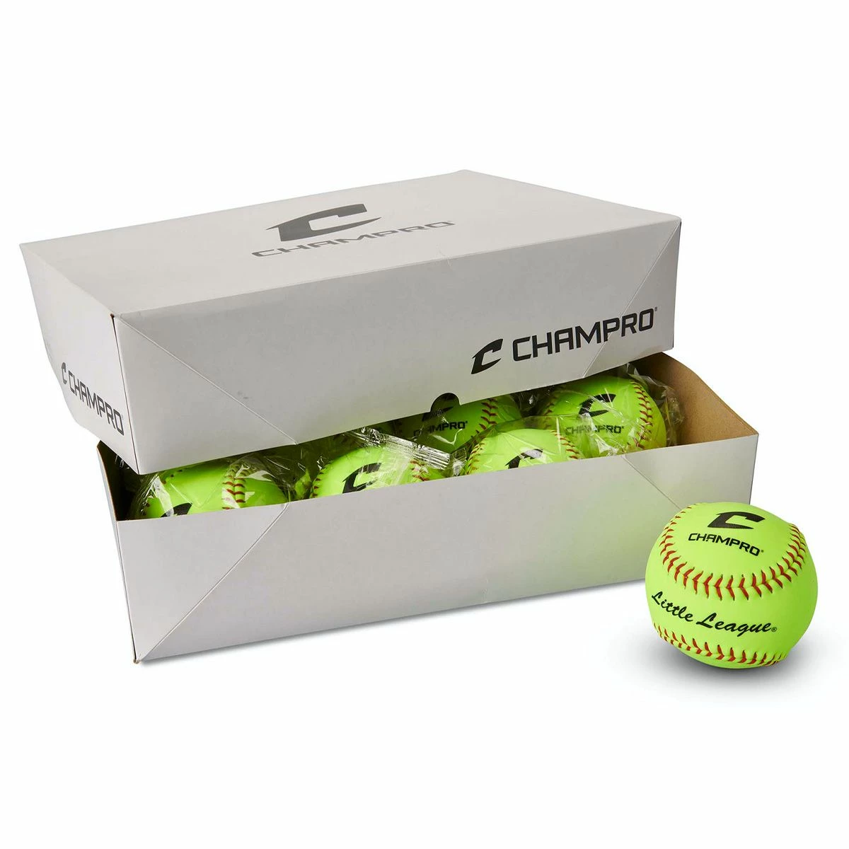 The Champro 11โ fastpitch softballs are Little Leagueยฎ approved and feature an optic yellow durahide cover with red stitching. These softballs are constructed with a solid polyurethane core, raised seams, .47 COR, and 375 compression.