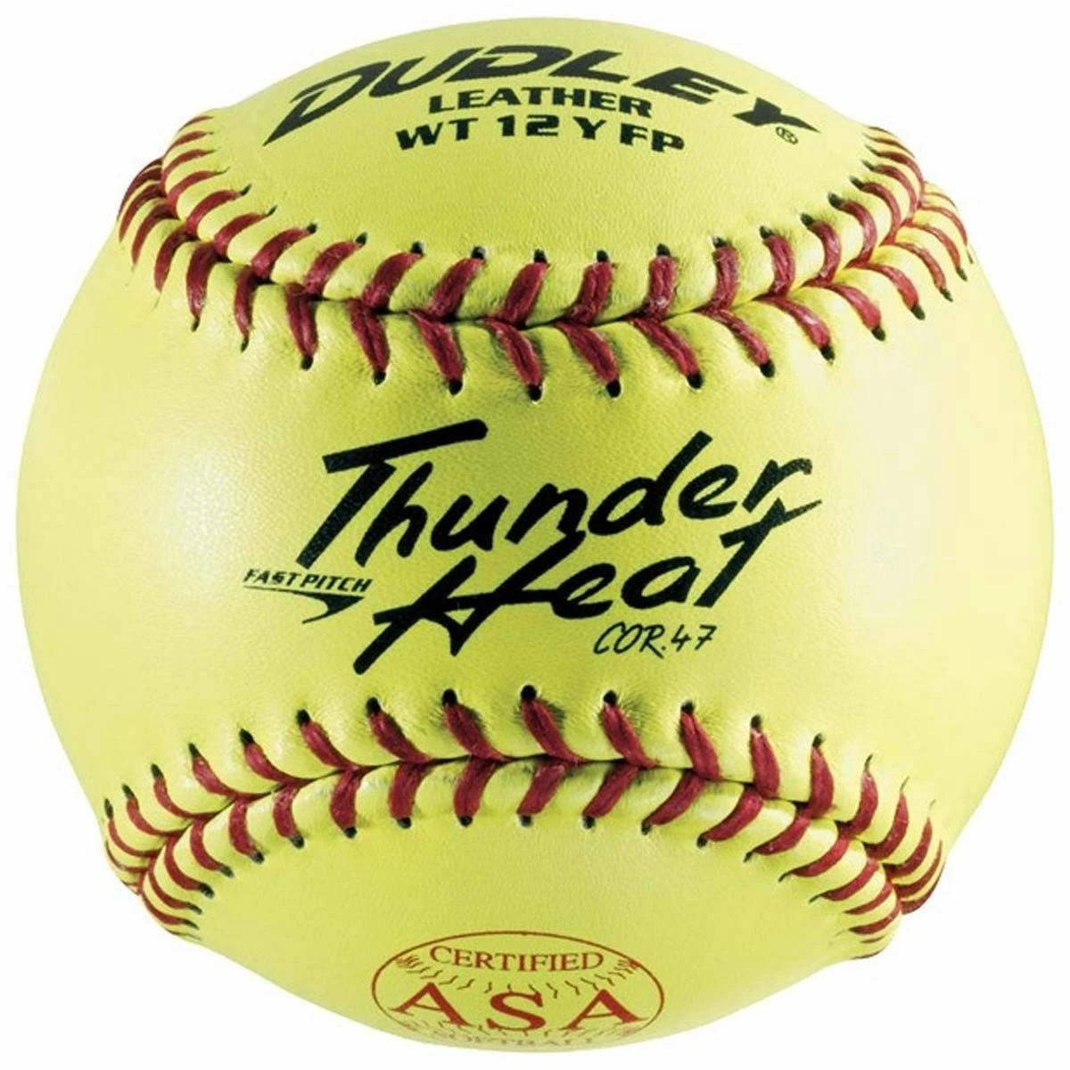 The Dudley Thunder Heat 4A-147Y ASA fastpitch softball has a leather cover that provides a good feel and excellent durability. The Dudley 4A-147Y is made with a poly center that has a precision blended cross-linked system that has a high density and maximum resiliency. This official 12″ ASA softball is an ecxellent value for any program.