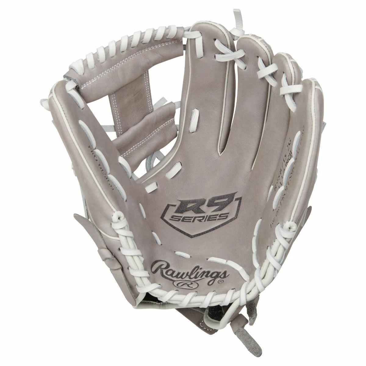 The Rawlings R9SB715-2G-3/0 R9 series fastpitch softball glove features a Pro Iβ’ Web design that suits all infield positions. This 11.75″ gray colored glove comes 80% broken in and is an instant gamer right out of its packaging. This Rawlings series boasts quality full-grain leather for increased durability and a leather cushioned palm padding for enhanced protection. With a pull-strap back and closures, this glove is designed for an improved fit and is easily adjustable.