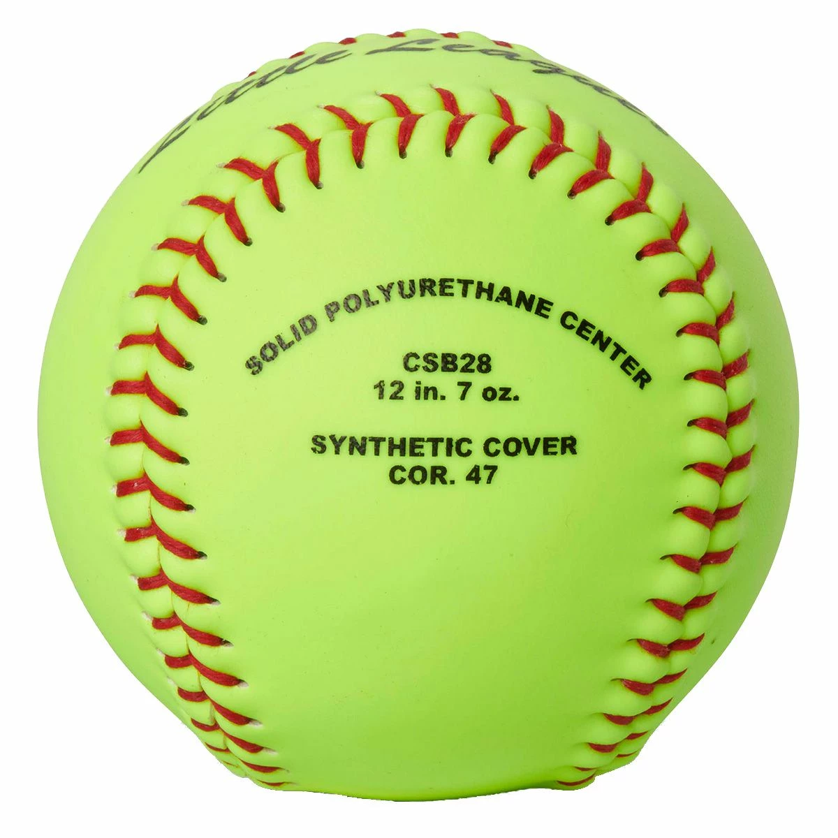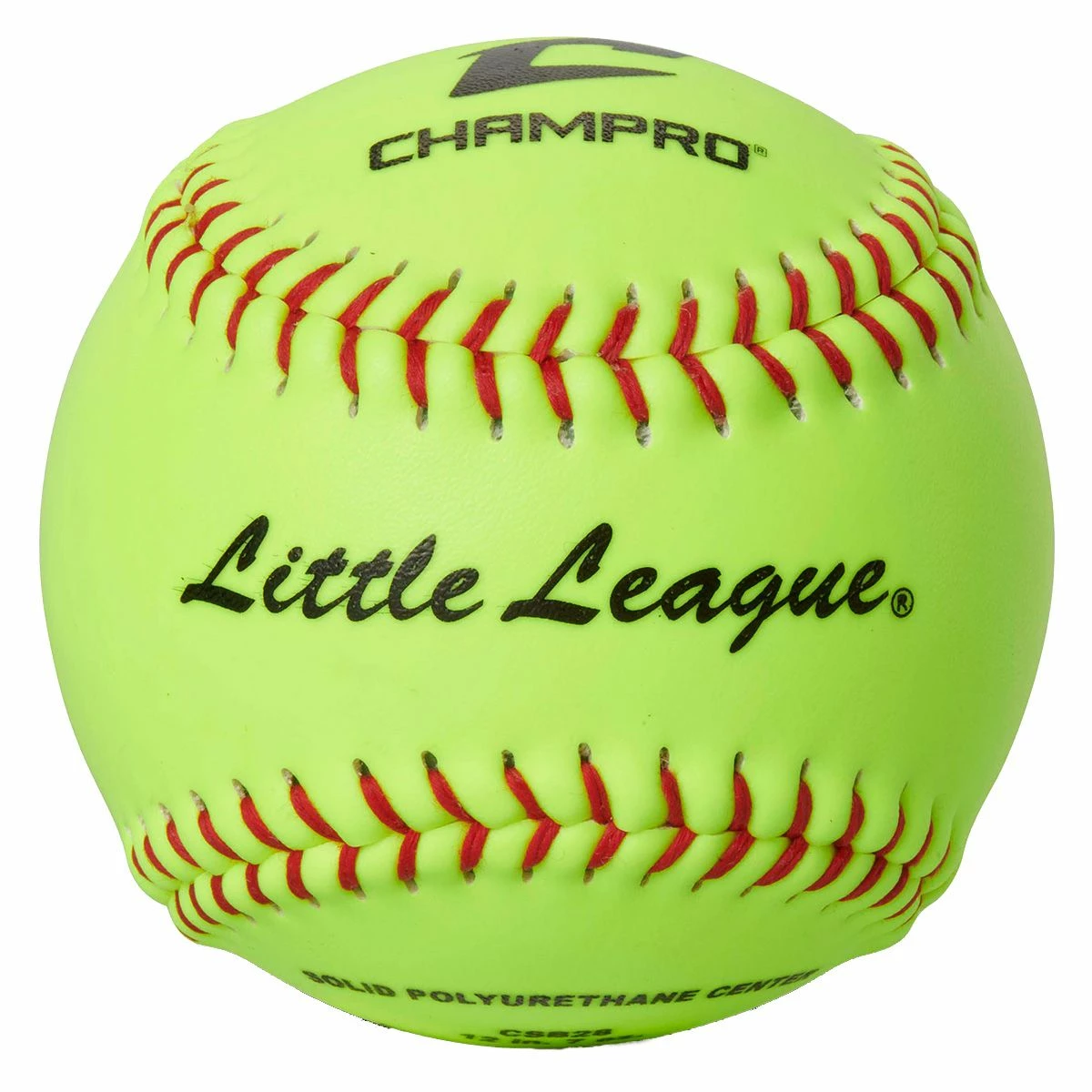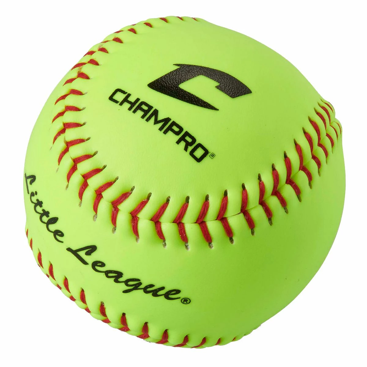 The Champro 12โ fastpitch softballs are Little Leagueยฎ approved and feature an optic yellow durahide cover with red stitching. These softballs are constructed with a solid polyurethane core, raised seams, .47 COR, and 375 compression.